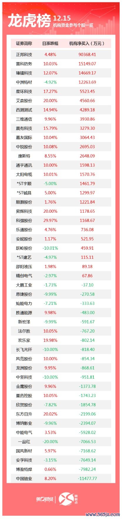 盘后数据显示,12月15日龙虎榜中,共47只个股出现了机构的身影,有25只股票呈现机构净买入,22只股票呈现机构净卖出。